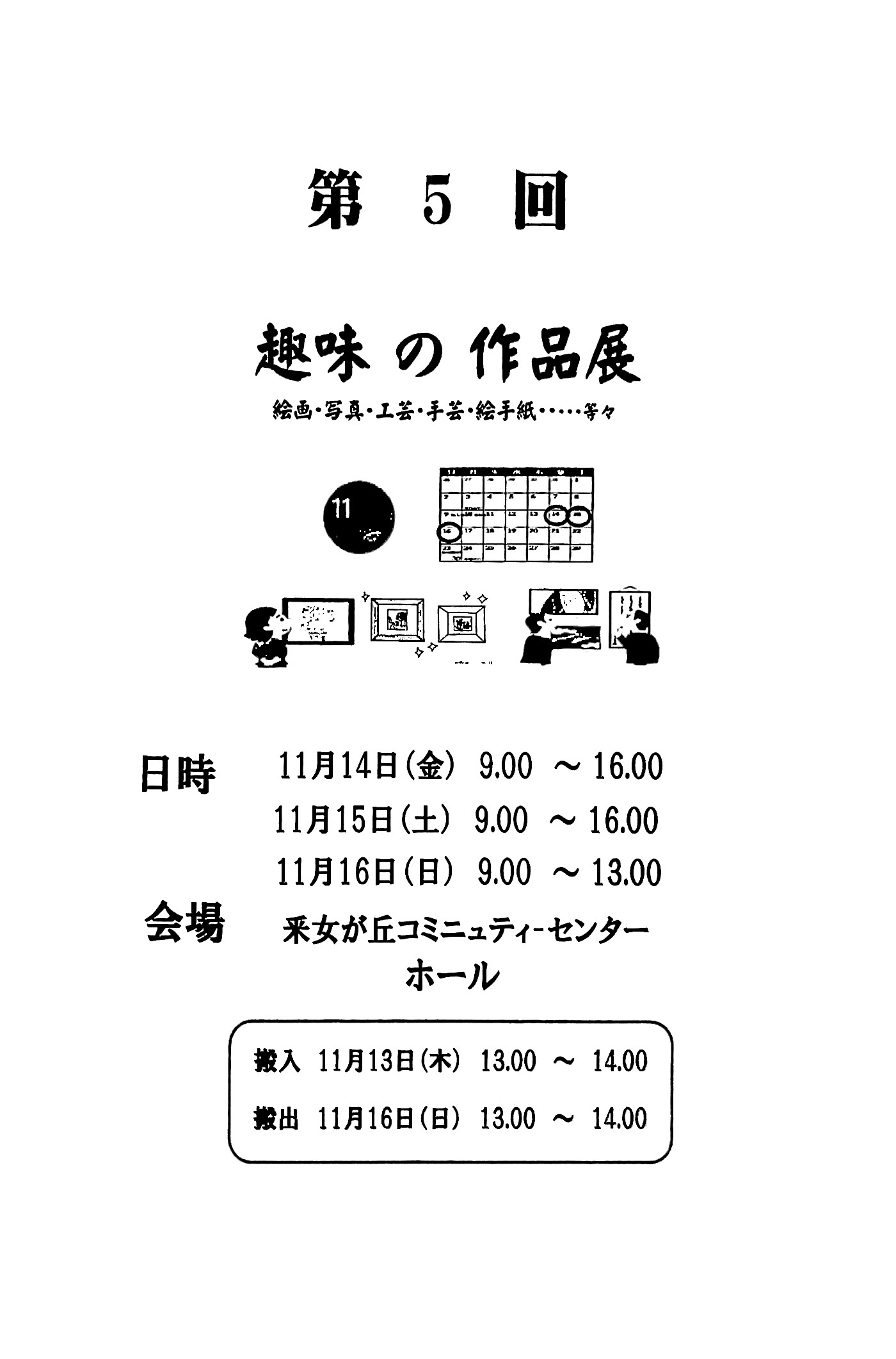 | 第5回 趣味の作品展について :2025年10月22日 2025年11月14日(金)~16日(日)にかけて、コミュニティセンターで「第5回 趣味の作品展」が開催されます。 例年、すばらしい作品が展示されているので、興味のある方はご鑑賞ください。 ・・・詳細はこちら Ac数:71 |